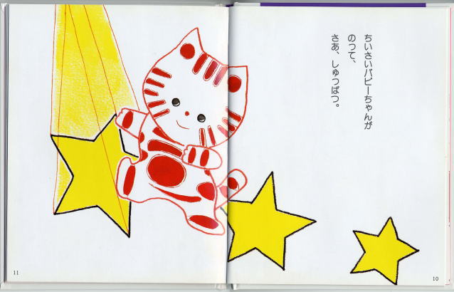 ここには、食いしんぼうで、冒険好きの幼児を、更 には、現実と空想を自由に行き来する幼児の感受性 をイキイキと刺激してくれます。絵本「ちいさいパピーちゃんのほしのくに」(ページ10-11)の絵を紹介しております。