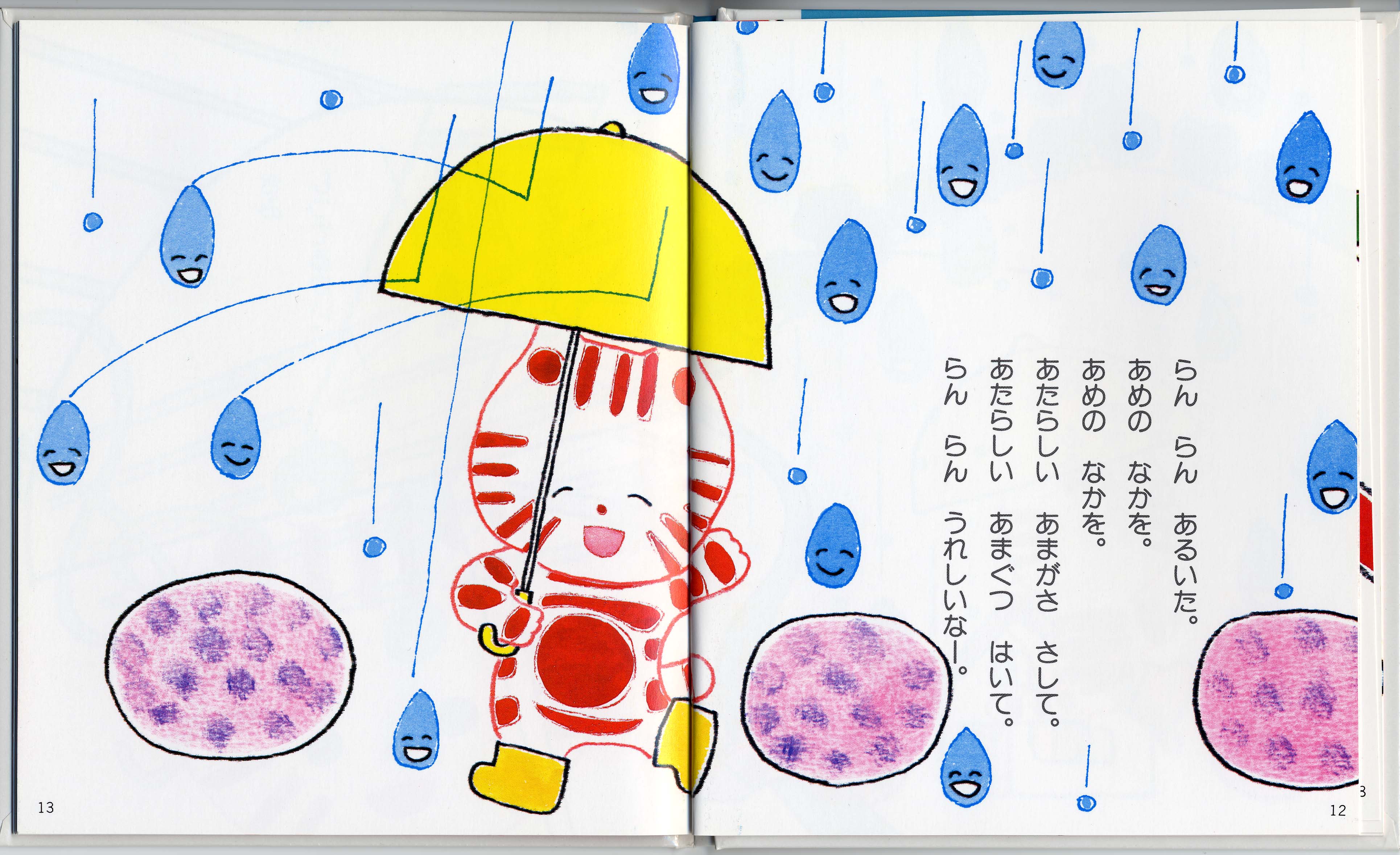ここでは、雨ふりをこんなにも喜べる幼児ならではの感激。絵本「ちいさいパピーちゃんのあまがさ」(ページ12-13)の絵を紹介しております。