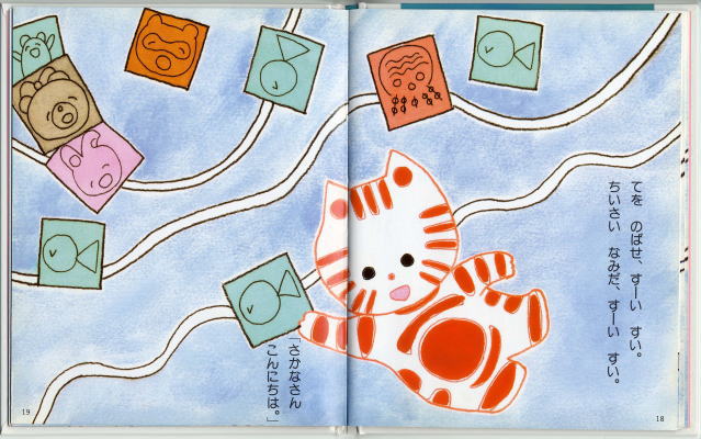 子どもの描く平面画に似ていますね。パピーちゃん&お友達の顔は、いつだって、すべて正面(平面画)を向いています。この子どもの平面画の感覚こそ、パピーちゃん絵本。