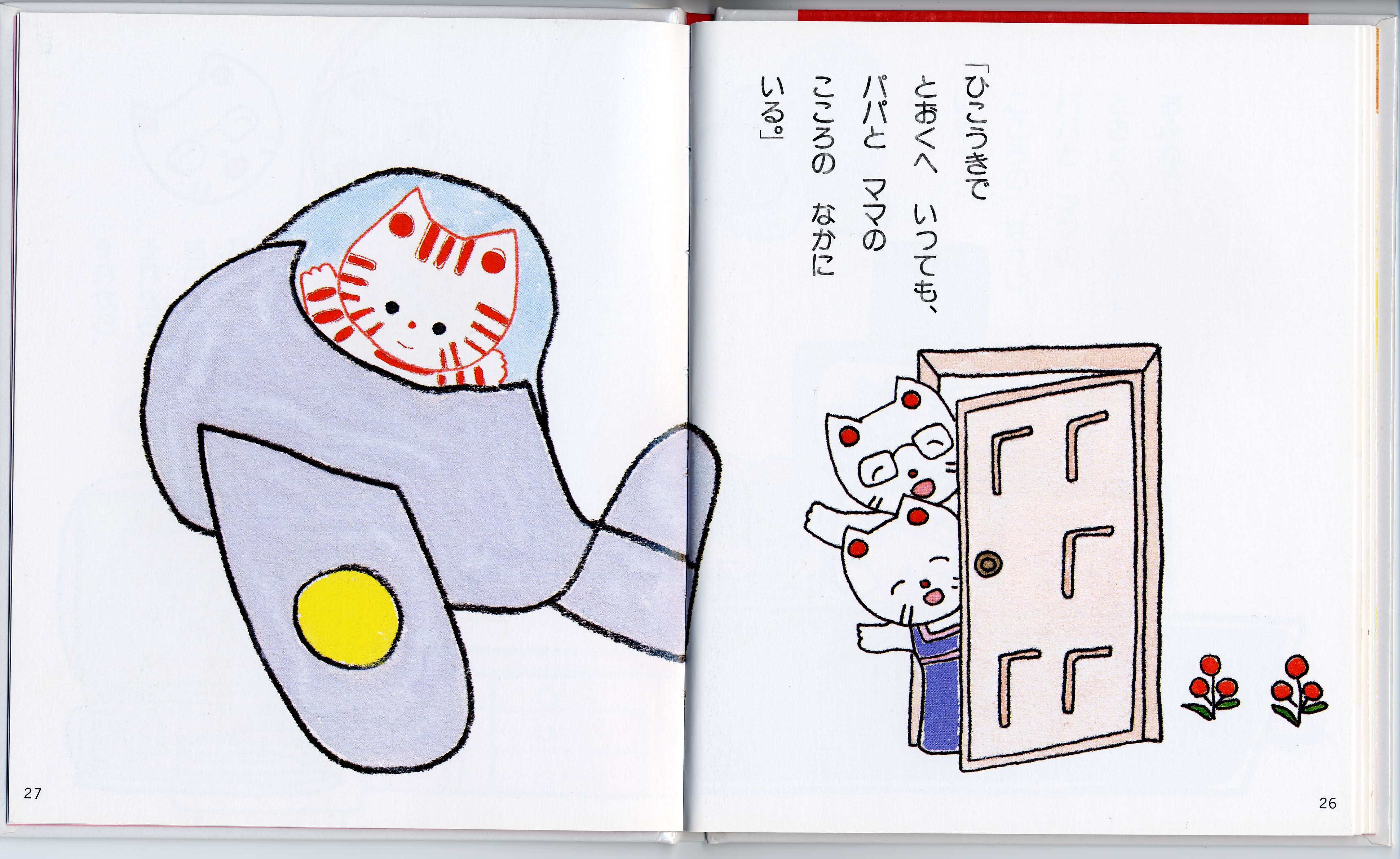 ここでの絵のように、絵本「パピーちゃんはどこにいる」では(ページ26-27)「ひこうきで とおくにいっても、パパとママの こころの なかに いる」と、あります。それは、未来の親子の繋がりを楽しく確認することで、今の親子の愛の繋がりを確認できるようにしています、ぜひ、絵本を通してお話されていただければと願っております。