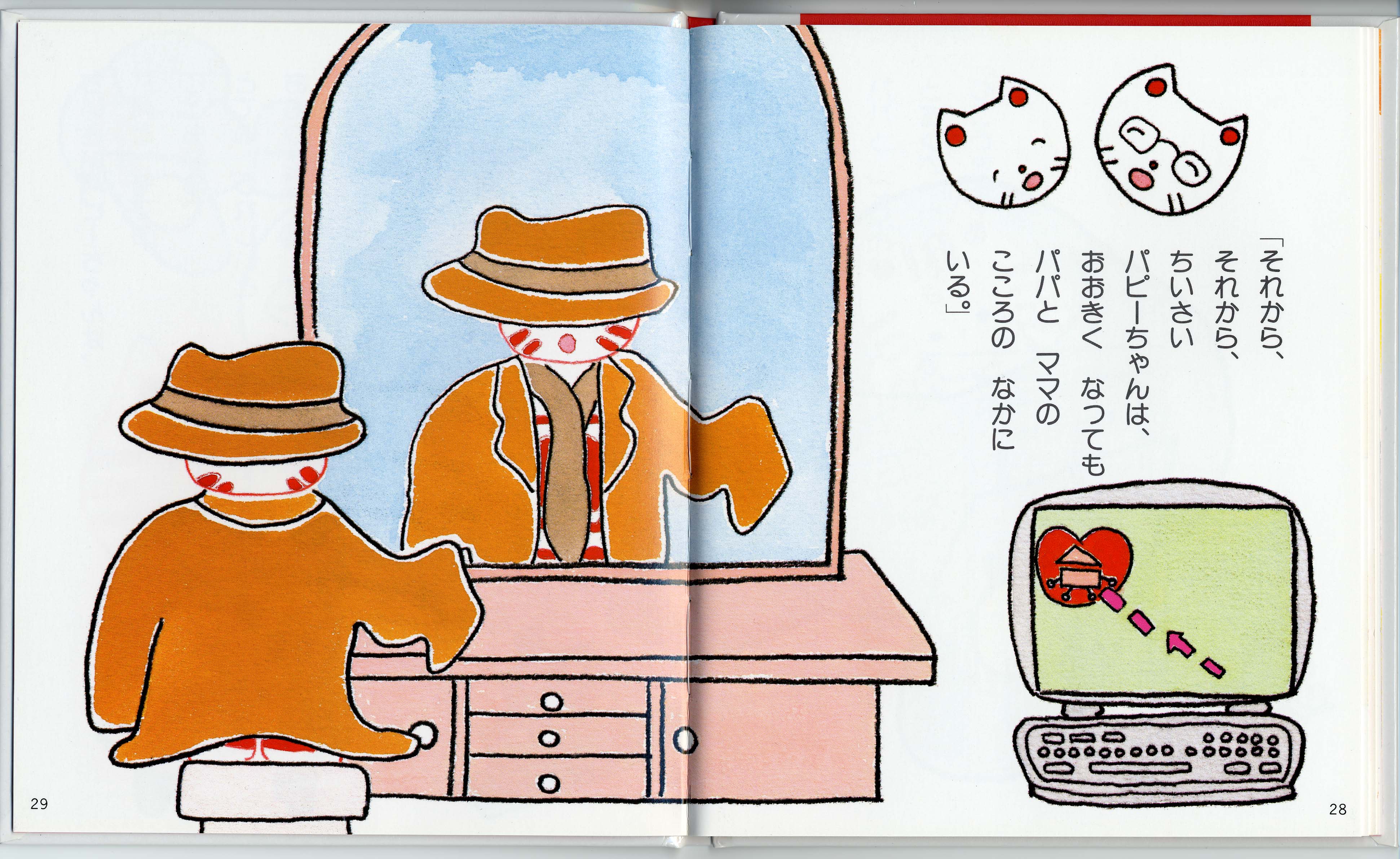ここでの絵のように、絵本「パピーちゃんはどこにいる」では(ページ28-29)「パピーちゃんは、おおきく なっても パパと ママの こころの なかに いる」と、あります。それは、未来の親子の繋がりを楽しく確認することで、今の親子の愛の繋がりを確認できるようにしています、ぜひ、絵本を通してお話されていただければと願っております。