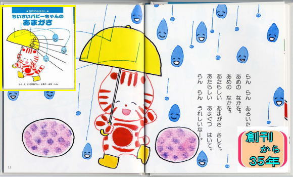 あらすじ:新しく買ってもらった雨傘と長靴。早く使いたくって雨を待ち望む思いと、待望の雨の中で心を響かせ遊び回るお話。テーマ・雨がさの楽しみ。