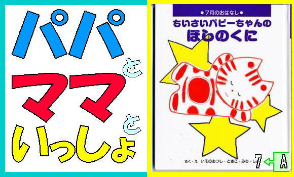 七タの空でハンバーグばかりでてきた星を食べる 気分は幼児にとって最高の気分。でも、夢中で食べ ていたら、ハンバーグはどんどん小さくなって、みんな下へまっさかさま。はっと気がついたらペットから落ちていたパピーちゃん。